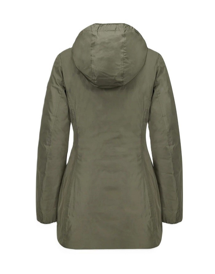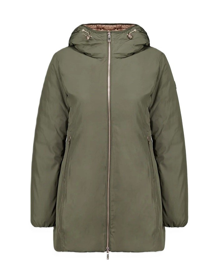 Piumino lungo reversibile in colore verde da donna imbottito in vera piuma 800 fill power reversibile che consente due opzioni di utilizzo in quanto combina un lato in tessuto liscio e l’altro in nylon trapuntato.