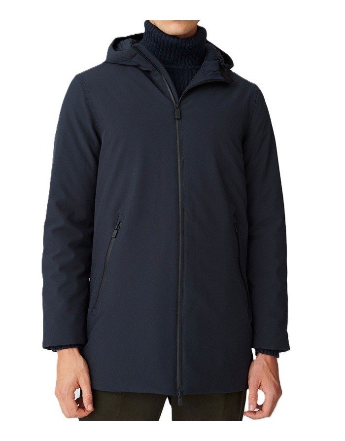 Giacca blu con cappuccio, realizzata in tessuto softshell 3 layers ed imbottita in vera piuma 90/10.