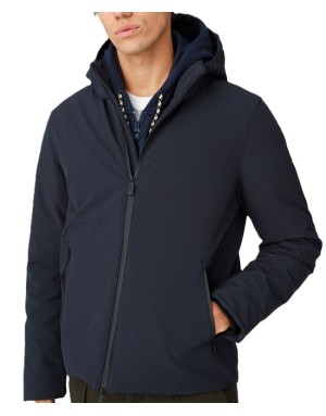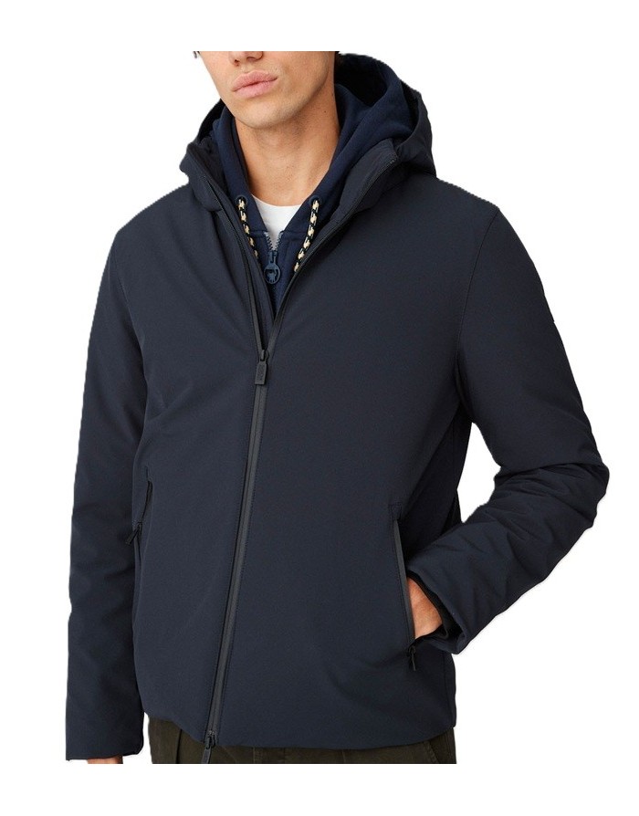 Giacca blu con cappuccio, realizzata in tessuto softshell 3 layers con laminazione dry-tech ed imbottita in vera piuma 90/10.