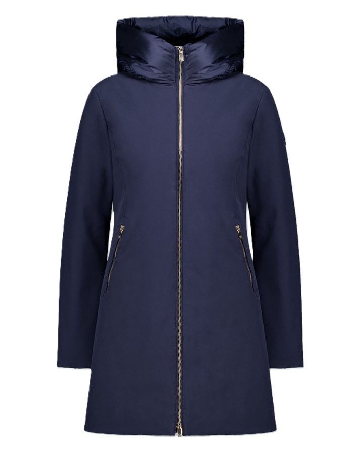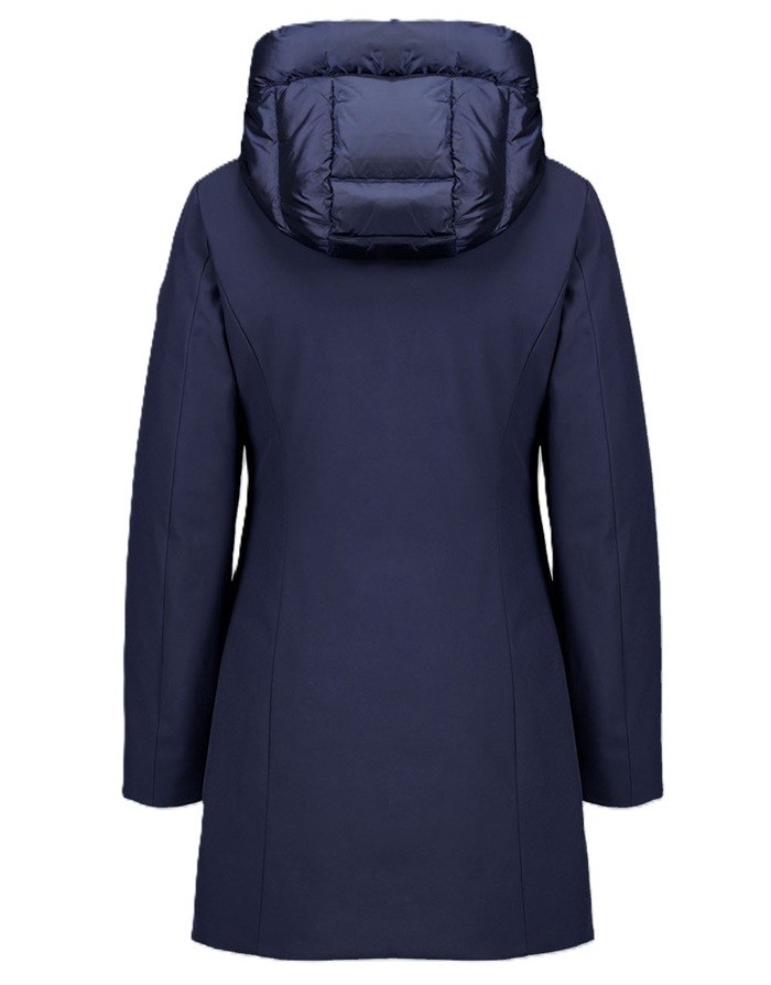Giacca lunga blu da donna realizzata in tessuto softshell 3 layers con laminazione dry-tech ed imbottita in vera piuma 90/10.