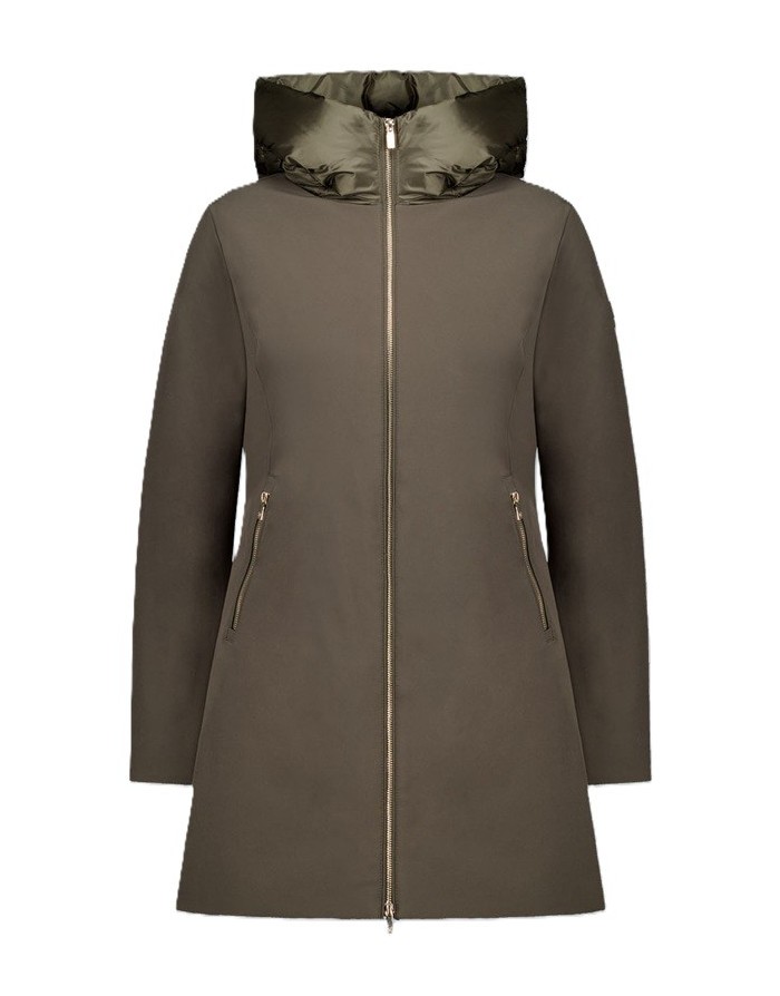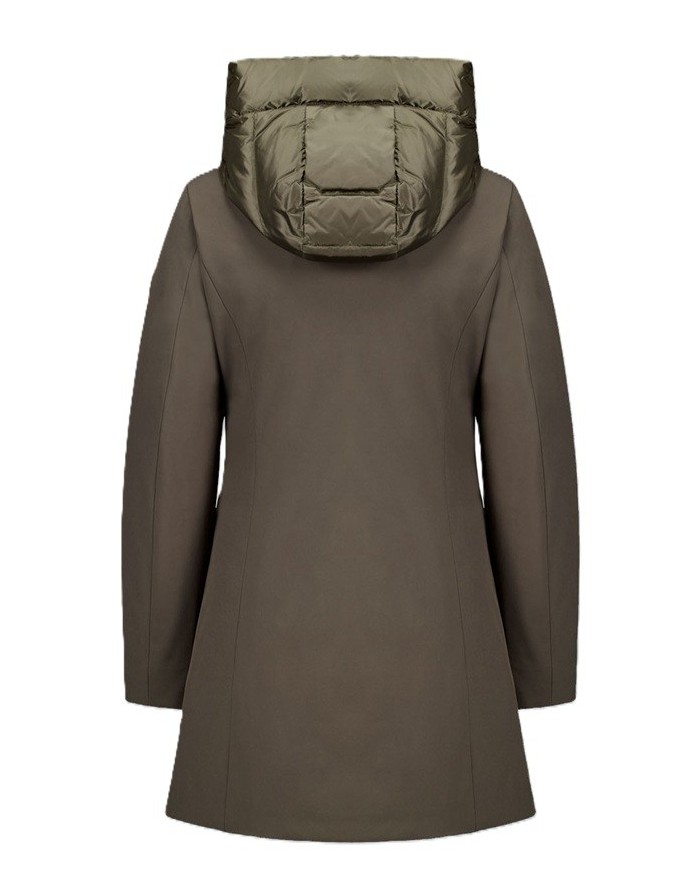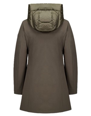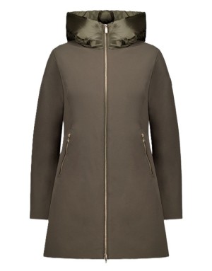 Giacca lunga verde da donna realizzata in tessuto softshell 3 layers con laminazione dry-tech ed imbottita in vera piuma 90/10.