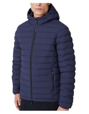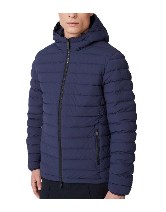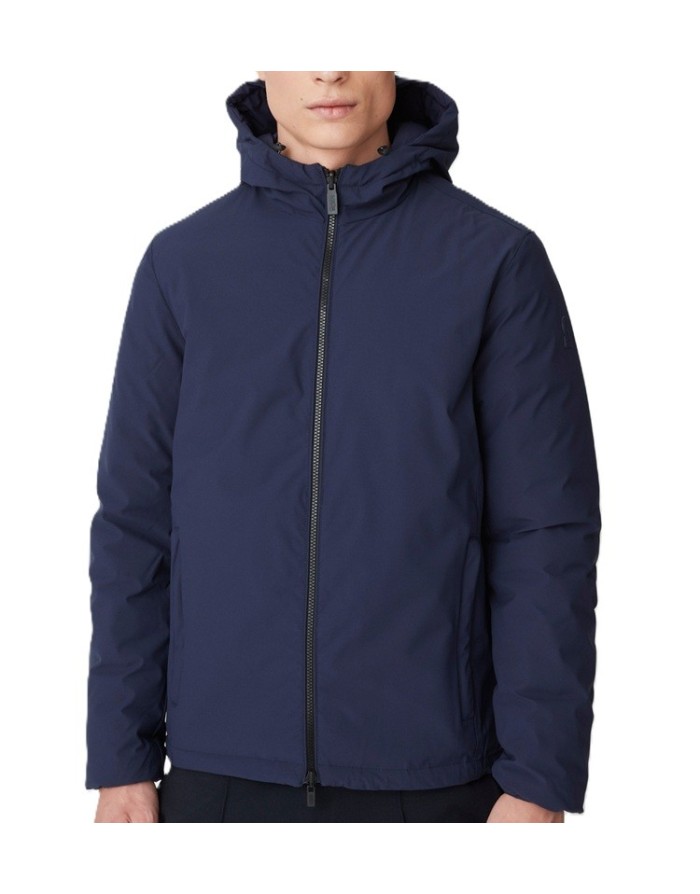 Piumino blu reversibile, realizzato in tessuto stretch 2 strati dotato di membrana ed imbottito in vera piuma certificata 800 fill power.