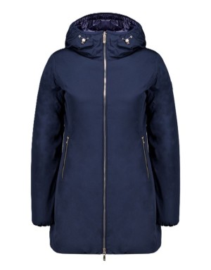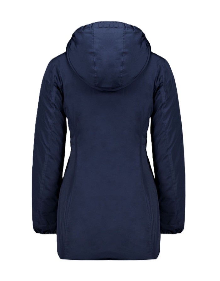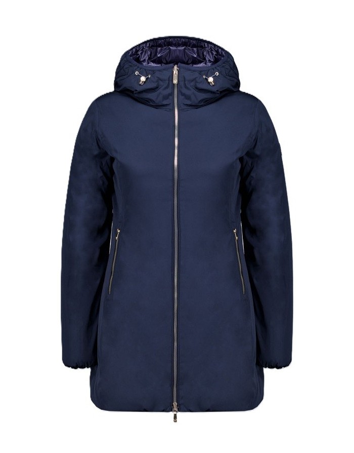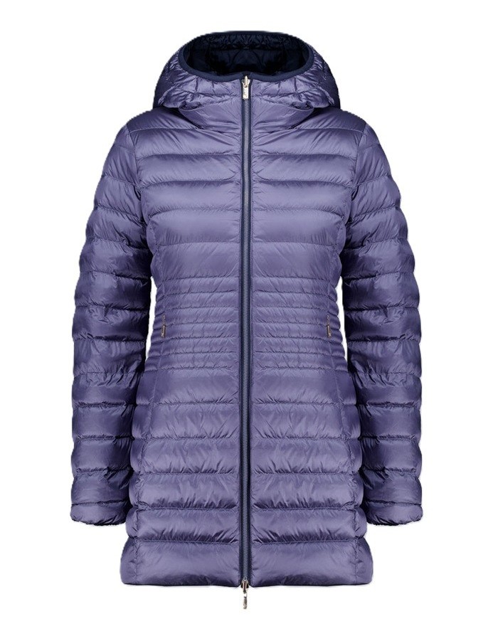 Piumino lungo reversibile in colore blu da donna imbottito in vera piuma 800 fill power reversibile che consente due opzioni di utilizzo in quanto combina un lato in tessuto liscio e l’altro in nylon trapuntato.