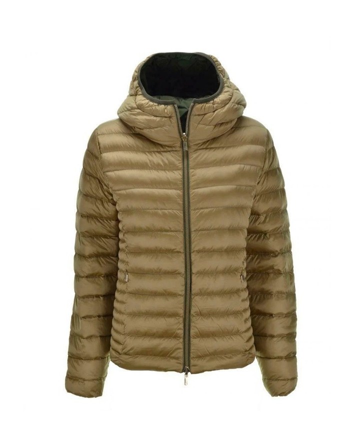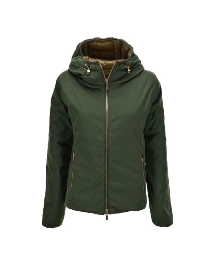 Il capo è realizzato in due tessuti, nella parte liscia verde in tessuto taffetàs e caratterizzato da doppio cursore e zip in metallo gold, e logo istituzionale Ciesse Piumini in tono.