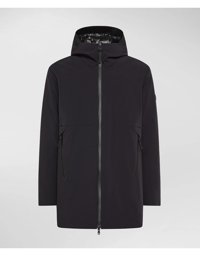 Trench liscio in nylon elasticizzato accoppiato ad un jersey di nylon soffice e caldo, con imbottitura in Primaloft. Full zip centrale nera spalmata con doppio cursore, collo in piedi con profilo nero, tasche laterali e polsini antivento. Il modello, dalla vestibilità slim, può essere indossato come sopra giacca. Il carattere essenziale e l’assenza di impunture rendono questo capo funzionale e rigoroso, adatto alle occasioni più formali.