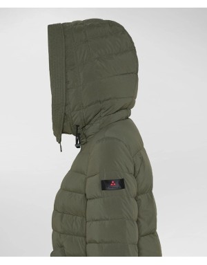 Piumino a trapunte in piuma naturale, in nylon leggero e microfibra di poliestere che, grazie alla temperatura di tintura a 130°C, si modifica, acquisendo una mano strutturata e un tatto polveroso.