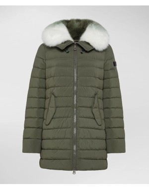 Full zip centrale con doppio cursore, ampie tasche laterali e collo con pelliccia di volpe in tono colore col capo.